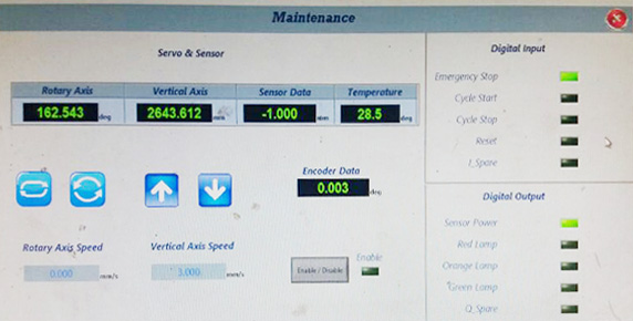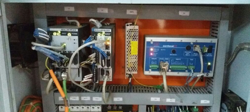 Confocal Sensor is used with Kollmorgen Cartridge Motor for high precision measurements. Its a 2 Axis machine with vertical axis and Indexing Axis. For Each Axis Rotaion 1000 Data Points captured and 3D Model Plotted with Measurements of Cylindricity, Ovality and Inner Diameter.