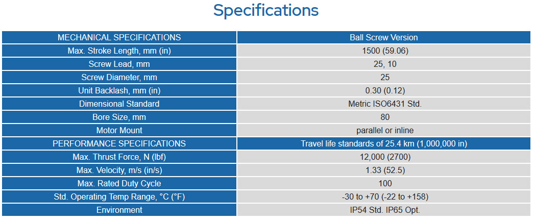 The EC4 Series provides robust electric cylinders for heavy-duty thrust loads. Precision-rolled ball screw types yield quiet operation, low backlash and high accuracy, with a selection of motor-to-screw reduction types. Exceptionally durable bearing and drive housings are available with optional environmental features to resist moisture and contaminants. The special design of these cylinders minimizes the need for routine maintenance.