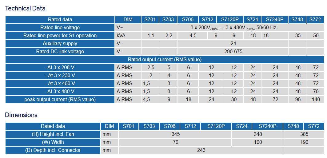 The S700 is a digital servo drive with extended functionality that is ideal for complex drive tasks. It incorporates onboard Ethernet connectivity for use with EtherCAT® and SynqNet™, and the optional MMC memory card enables parameter records and firmware to be easily backed up in the field. A Safe Torque Off function is standard, and other safety functions can be added. Single Cable feedback with both SFD3 and Hiperface DSL is also supported.